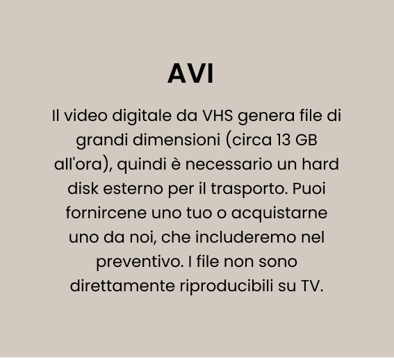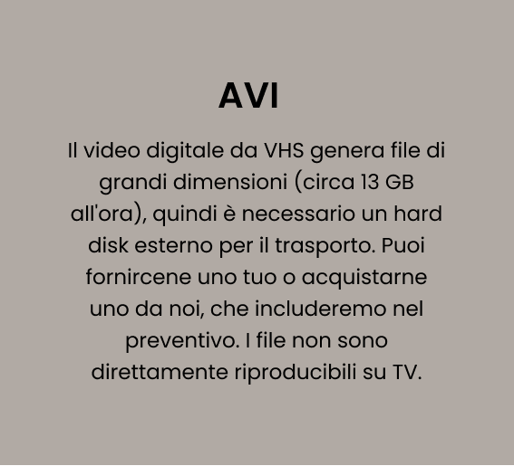Digitalizzali in file .avi con attrezzatura professionale per preservarne la qualità e salvarli per sempre