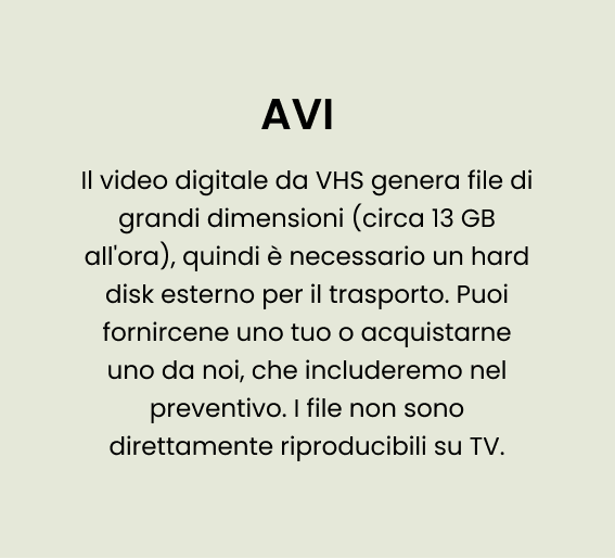 Digitalizzali in file .avi con attrezzatura professionale per preservarne la qualità e salvarli per sempre.