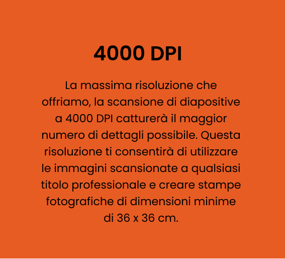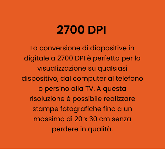 Offriamo 2 opzioni di risoluzione per la digitalizzazione delle vostre diapositive, oltre alla scelta del formato Jpeg o Tiff.